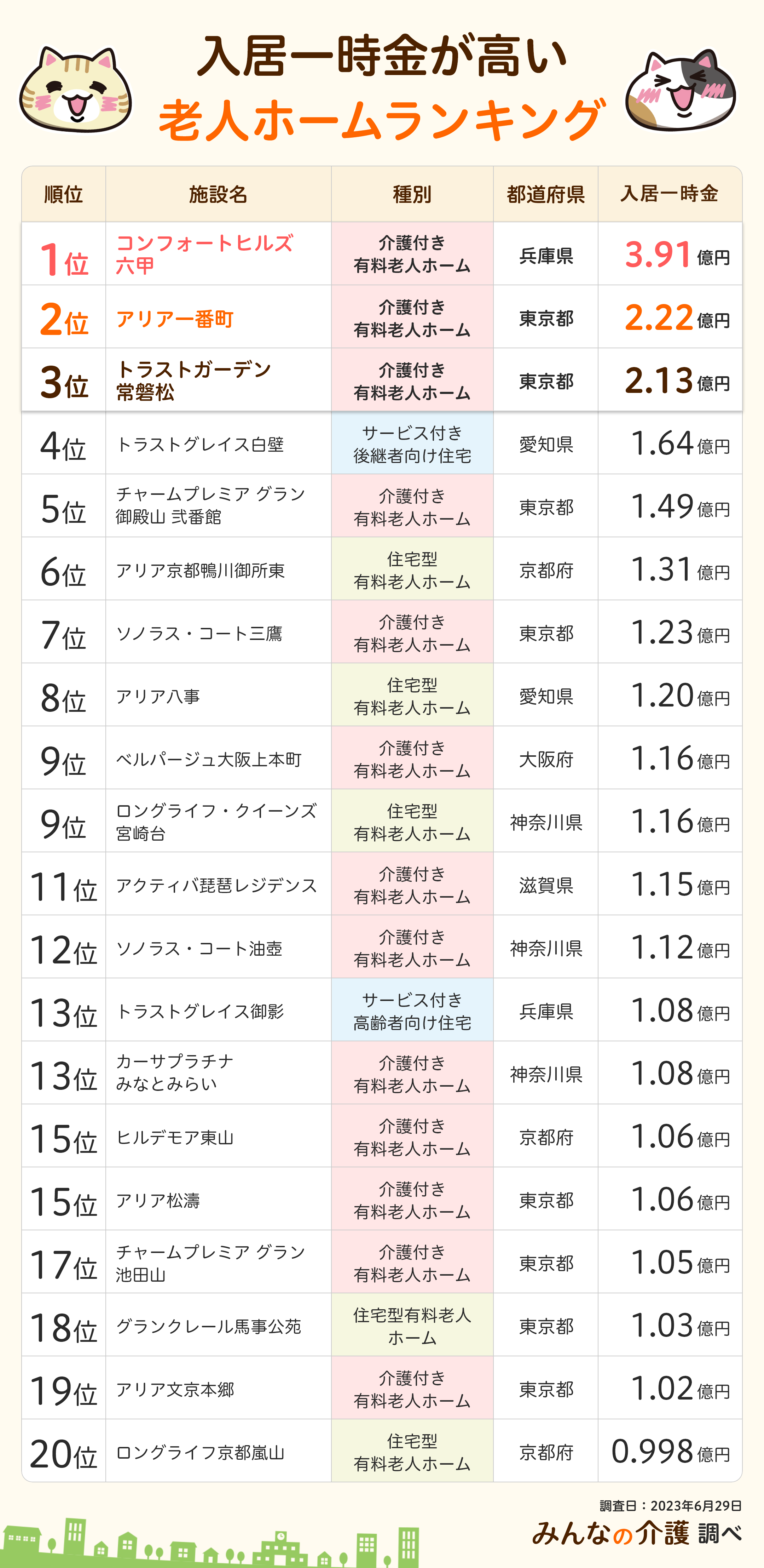 方法 みんなの介護に掲載中の全施設(51,901件)のうち入居一時金の上限値が高い順に上位20施設を集計
