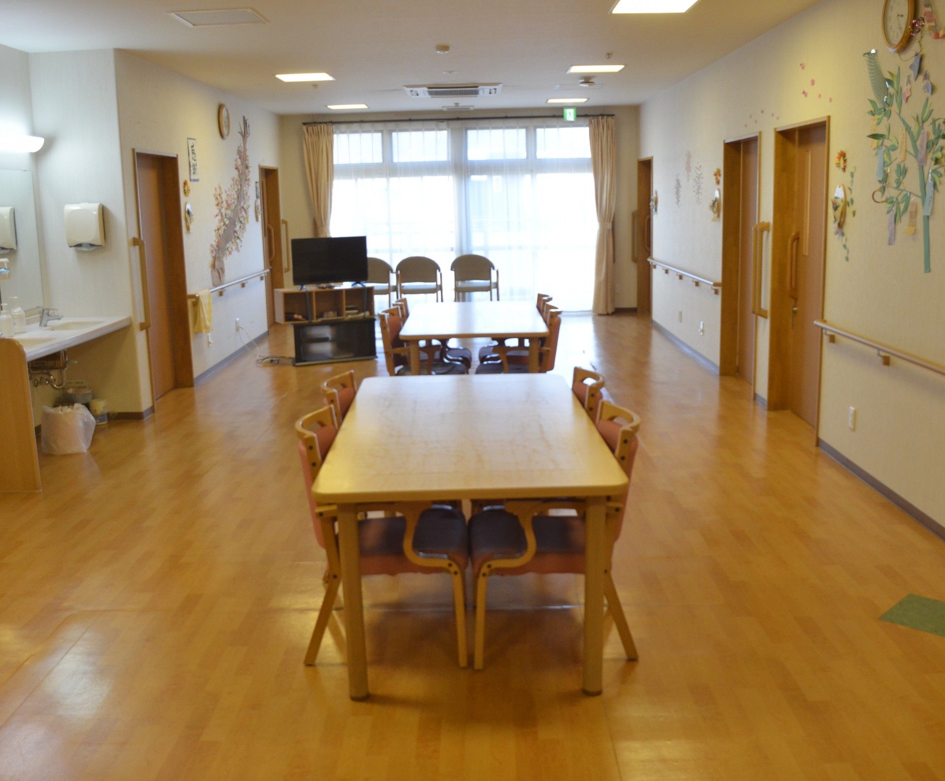 広々とした屋内施設で、思い思いの生活を。ご入居者様一人ひとりの尊厳と幸せを第一に考えた、寄り添う介護をいたします。