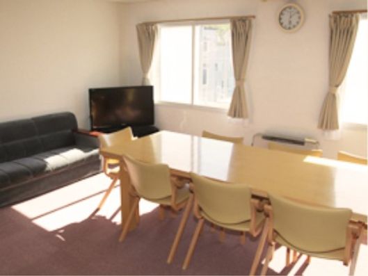 明るく開放的な食堂空間にはソファやテレビを設置。窓から日中明るい陽射しが注ぎ込みます。