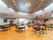 • グリーンやブラウンの椅子がセットされたダイイングテーブルが複数並んだ食堂。大きな窓がたくさんついていて明るい雰囲気。