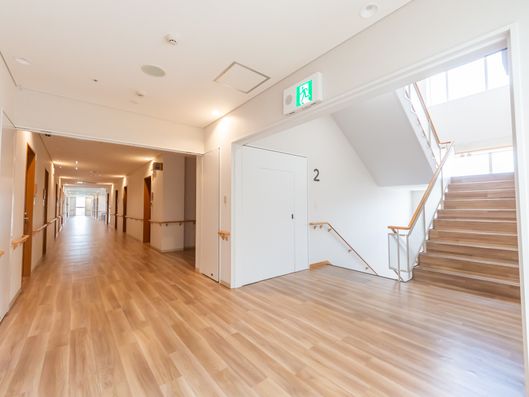 • まっすぐな廊下の突き当りには大きな窓があり、陽の光が入っている。両サイドに手すりが設置され、居室のドアはスライド式。