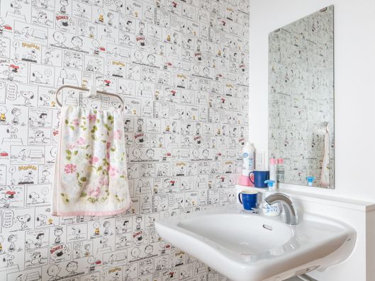 明るい気持ちで過ごしていただけるよう壁紙にも工夫をプラス。洗面所は車いす対応のデザインです。