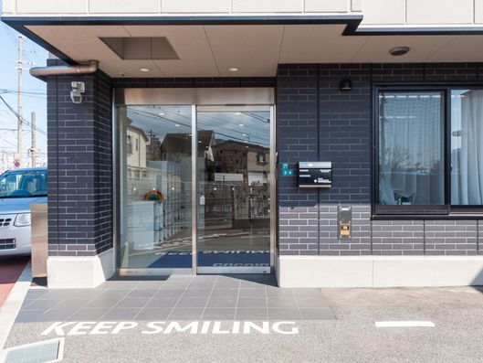 ガラス扉を通して日差しが差し込む、開放感ある入口です。"KEEP SMILING"の文字が迎えてくれ、心温まる雰囲気を感じられます。
