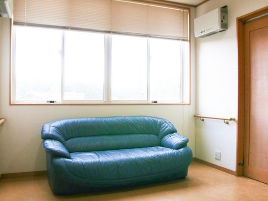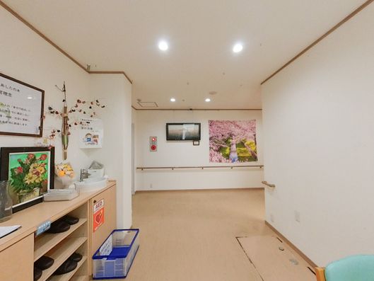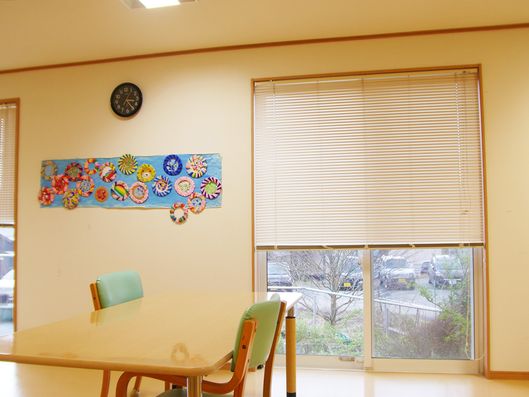 ゆったりとした空間で、明るく清潔感のある共有スペースです。壁に飾られた手作りの装飾が、温かみのある雰囲気を演出しています。