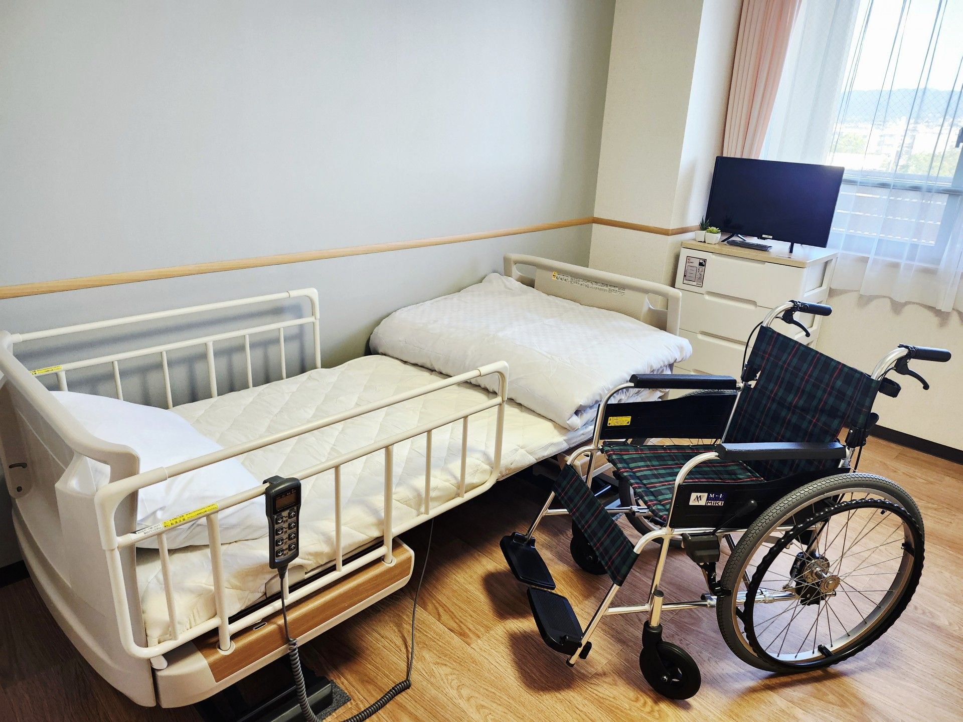 家具備え付きの居室はゆったりと過ごしていただける空間です。ケアコール完備で、スタッフが駆けつける体制を整えております。