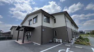 広々とした駐車場がある落ち着いた色調の建物です。バリアフリー設計で、どなたでも安心してお過ごしいただけます。