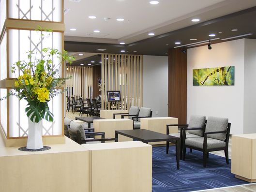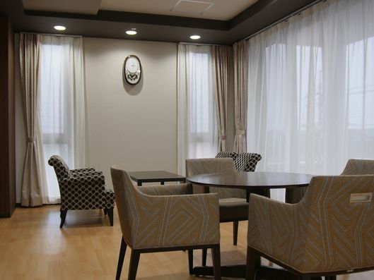 落ち着いた色合いの休憩スペースです。ゆったりとした椅子で、くつろぎのひとときをお過ごしいただけます。