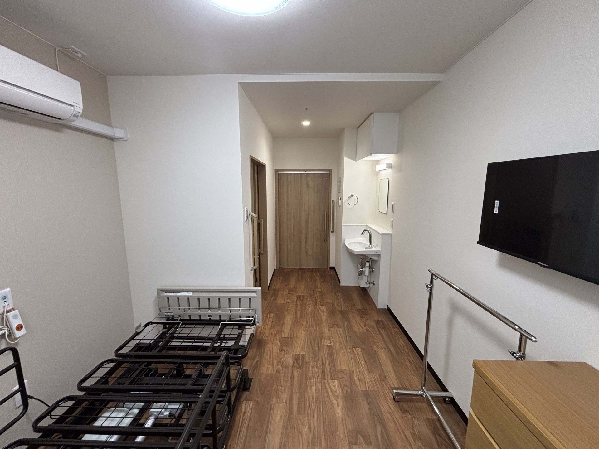 シンプルで機能的な居室です。テレビや洗面台が備え付けられており、快適に過ごせます。