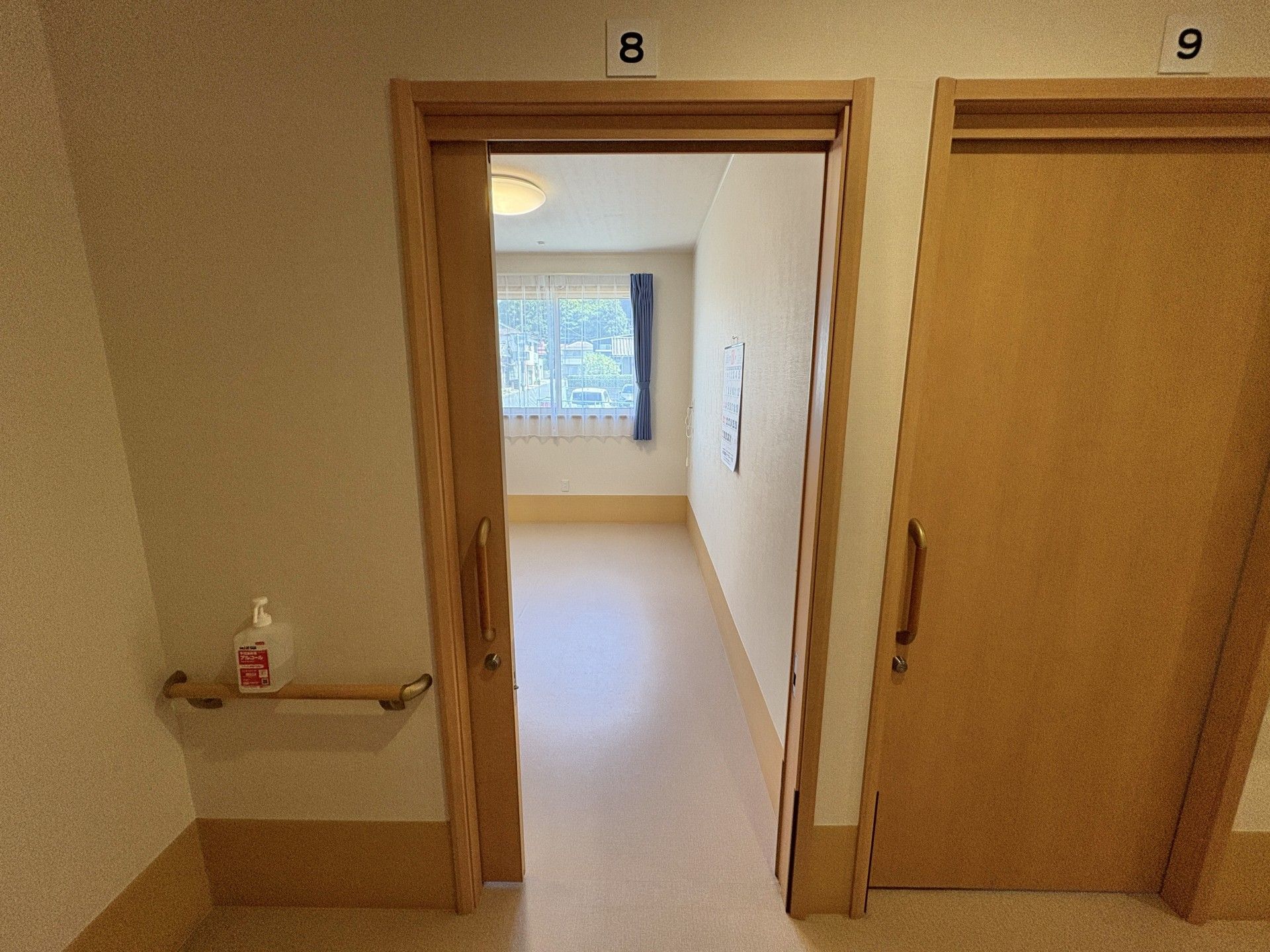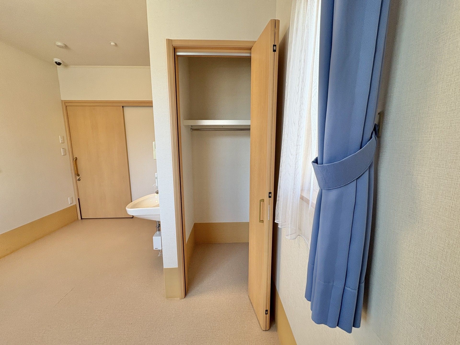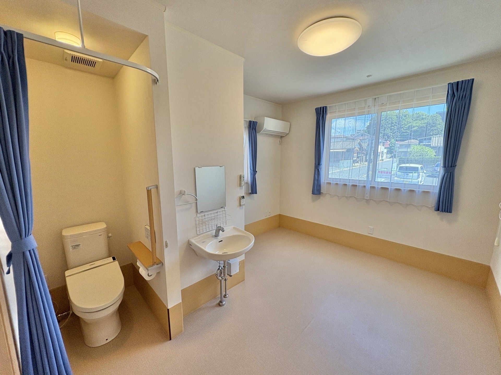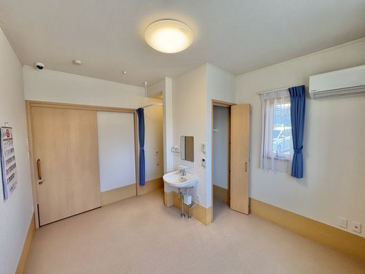 「ケアステージ 鹿島」では全室個室で、トイレや洗面所、収納スペースがそれぞれのお部屋に付いております。トイレや洗面所は専用のもので、他の方と共有はしないので、感染症が流行る時期にも感染リスクを抑えることが可能です。介護度の高い方がおひとりで過ごすことを不安に思う方もいらっしゃいますが、スタッフが定期的に館内を巡回し、何かあれば居室の緊急通報装置からスタッフを呼び出せるので安心です。