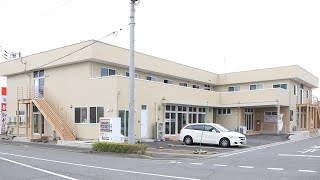 • クリーム色の2階建ての施設の敷地には、駐車場が完備されている。また、近くにはスーパーなどがあり利便性に優れている。