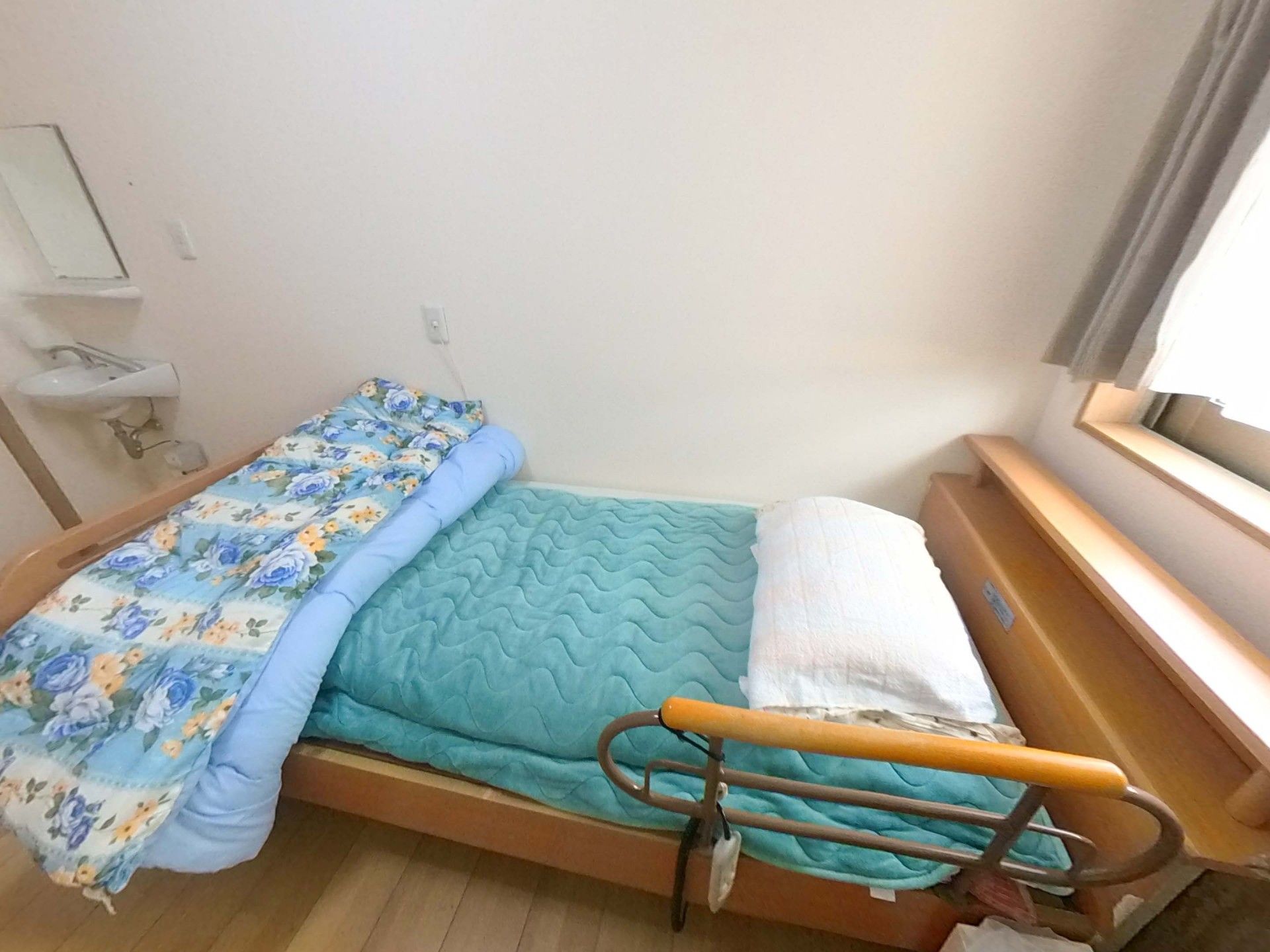 窓からの自然光が心地よい空間です。ベッドは手すり付きで、安全に配慮されています。