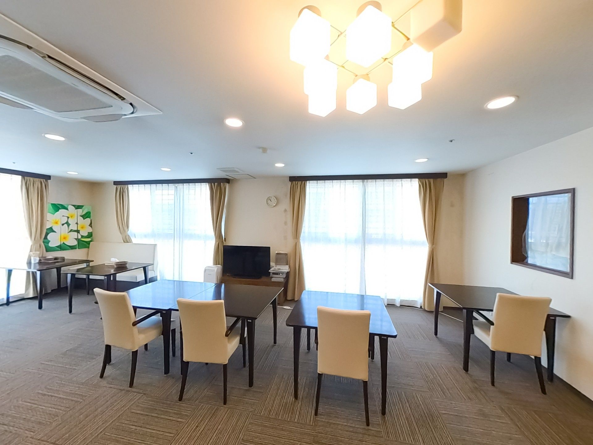 大きな窓から自然光が差し込み、心地よい空間を演出しています。エアコンも完備されています。