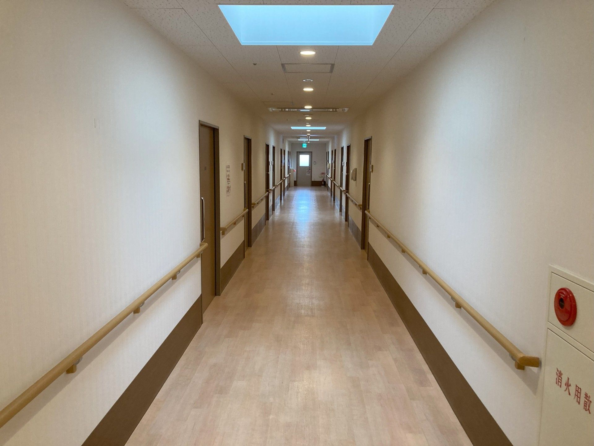 手すりが整った廊下は、歩行に不安がある方も安心してお過ごしいただける設計です。窓からは自然光が差し込み、温かな雰囲気を演出しています。