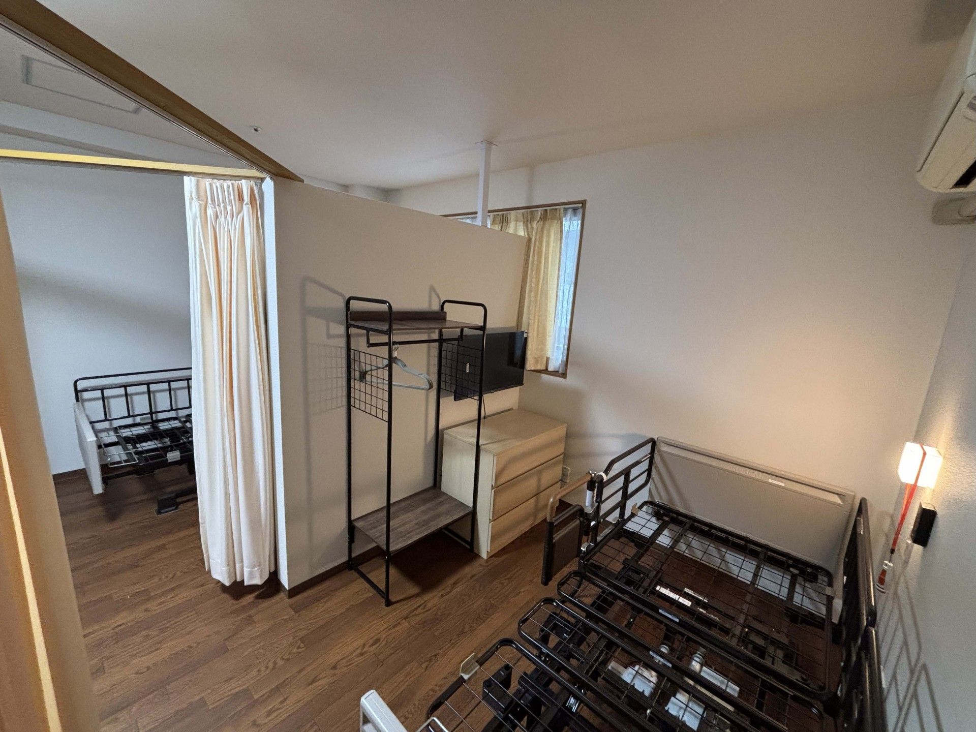 木目調の床と収納が整った居室です。カーテンで仕切られた空間で、プライバシーも確保されています。