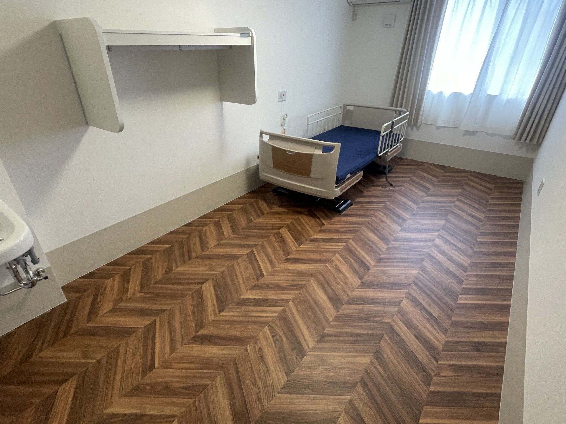落ち着いた色合いの床とシンプルなベッドが配置され、快適にお過ごしいただけます。
