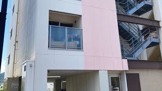 施設は5階建てで、外側に階段がついています。白をベースに茶色やピンク色の外壁で、細長い建物です。左に部屋のベランダがあります。