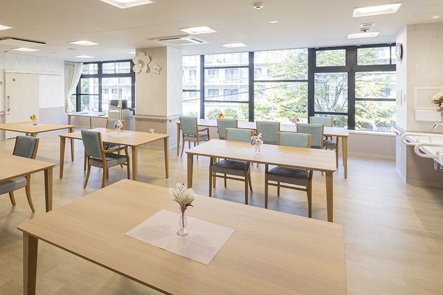 共用スペースは高級感あふれるインテリアと調度品で統一され、ご入居者様が優雅に過ごせる空間となっています。食堂は明るく開放的で、廊下も広々としており、アートが飾られた館内は清潔に保たれています。機械浴槽も完備しており、身体状況に合わせた入浴支援が可能です。施設内では季節の行事やカラオケ大会など、多彩なレクリエーションを提供しています。特にカラオケ大会は毎回大盛り上がりで、ご入居者様とスタッフの対決も行われる人気イベントです。食事は施設内厨房で管理栄養士監修の下、できたてを適温で提供し、季節の彩りも取り入れています。