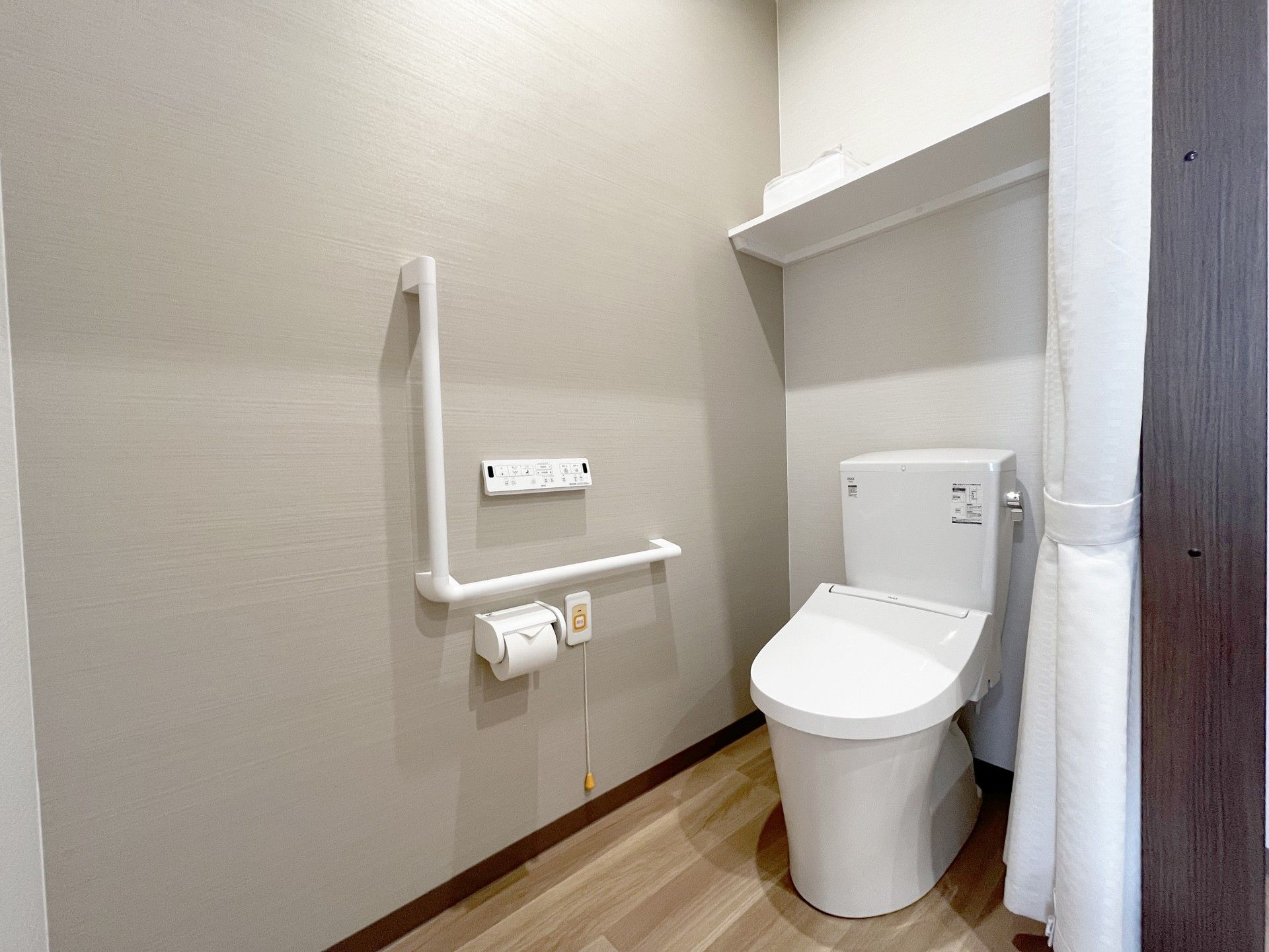 • 共用トイレ 1階の共用トイレは、面会にお越しいただく方にも安心してご利用いただけます。トイレには手すりが付いてお り、足腰が不自由な方でも利用しやすい設計です。オストメイト対応の流しも設置しております。