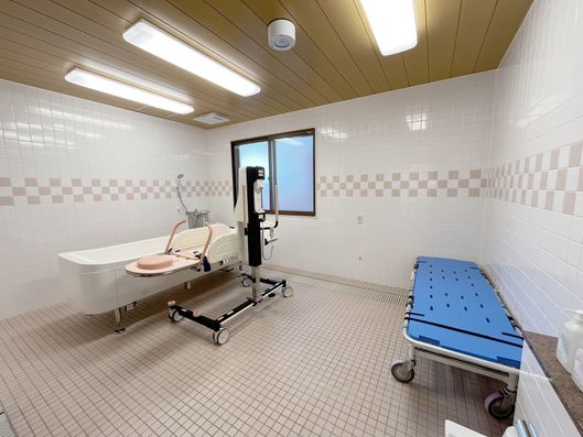 • 機械浴室 お身体が不自由な方でも、ストレッチャーを使って入浴できます。寝たままの状態で髪や身体を洗ったり、湯 船にもゆったりつかれて清潔に。ストレッチャー浴なら、安心してくつろいでいただけます