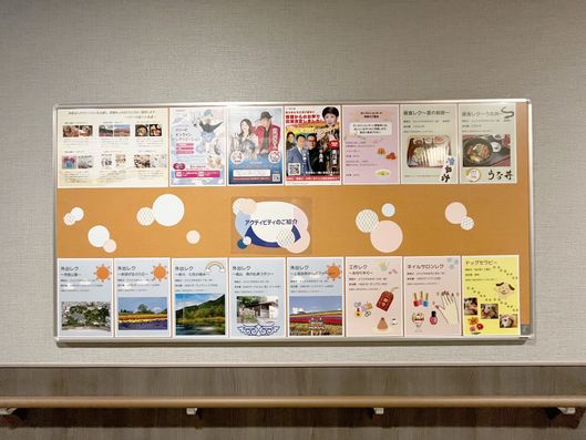 • 掲示物 多彩なアクティビティの案内が掲示されています。外出レクやエステ、ドッグセラピーなどが楽しめます。