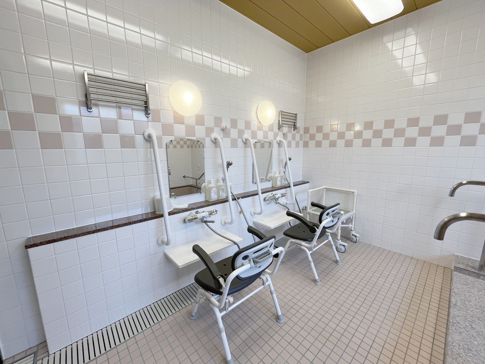 • 広々とした脱衣所には、使いやすい椅子と手すりが設置されており、安心してご利用いただけます。