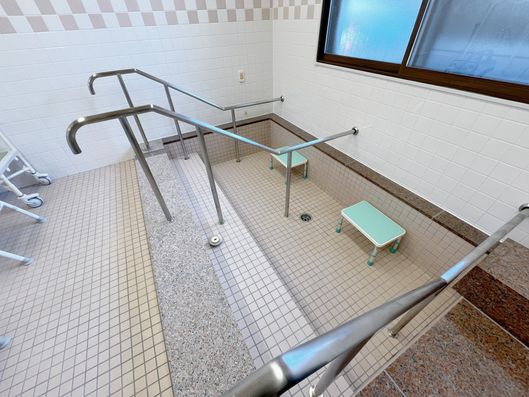 • 中浴室 浴室は、バリアフリー対応です。個浴槽のほか、中浴槽(数人用)も設置。気の合うご入居者様とゆっくり お風呂が楽しめます。暖房設備もついており、急激な温度変化でお身体に影響を与える心配がありません。