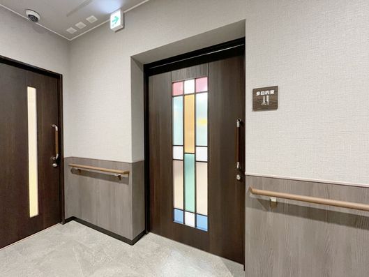 • 多目的室 色とりどりのガラスがはめ込まれた扉が特徴の多目的室です。手すりも設置されており、安心してご利用いただけます。