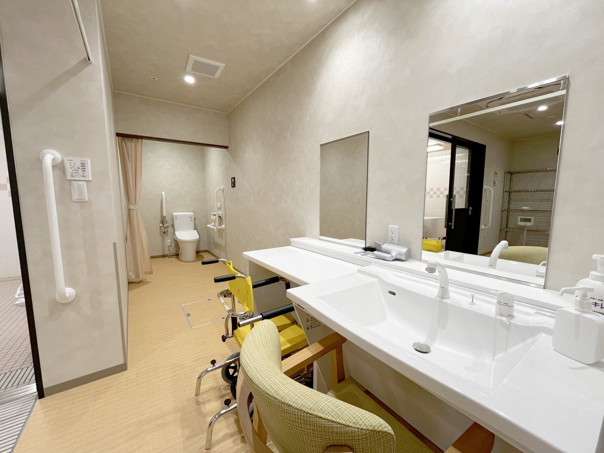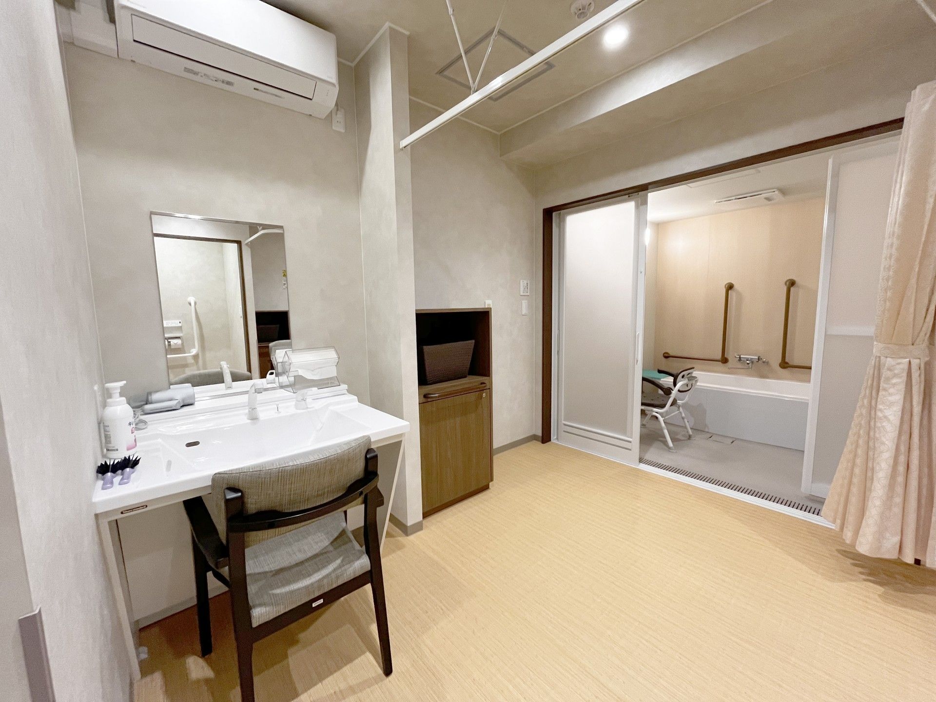 • 脱衣室 脱衣室は、車いすが複数台入れる広さです。車いすに乗ったまま量れる体重計や入浴用の車いすなどがそ ろっています。入浴までの導線に手すりが設置されているため、着替えから浴室まで安全に移動していただけ ます。