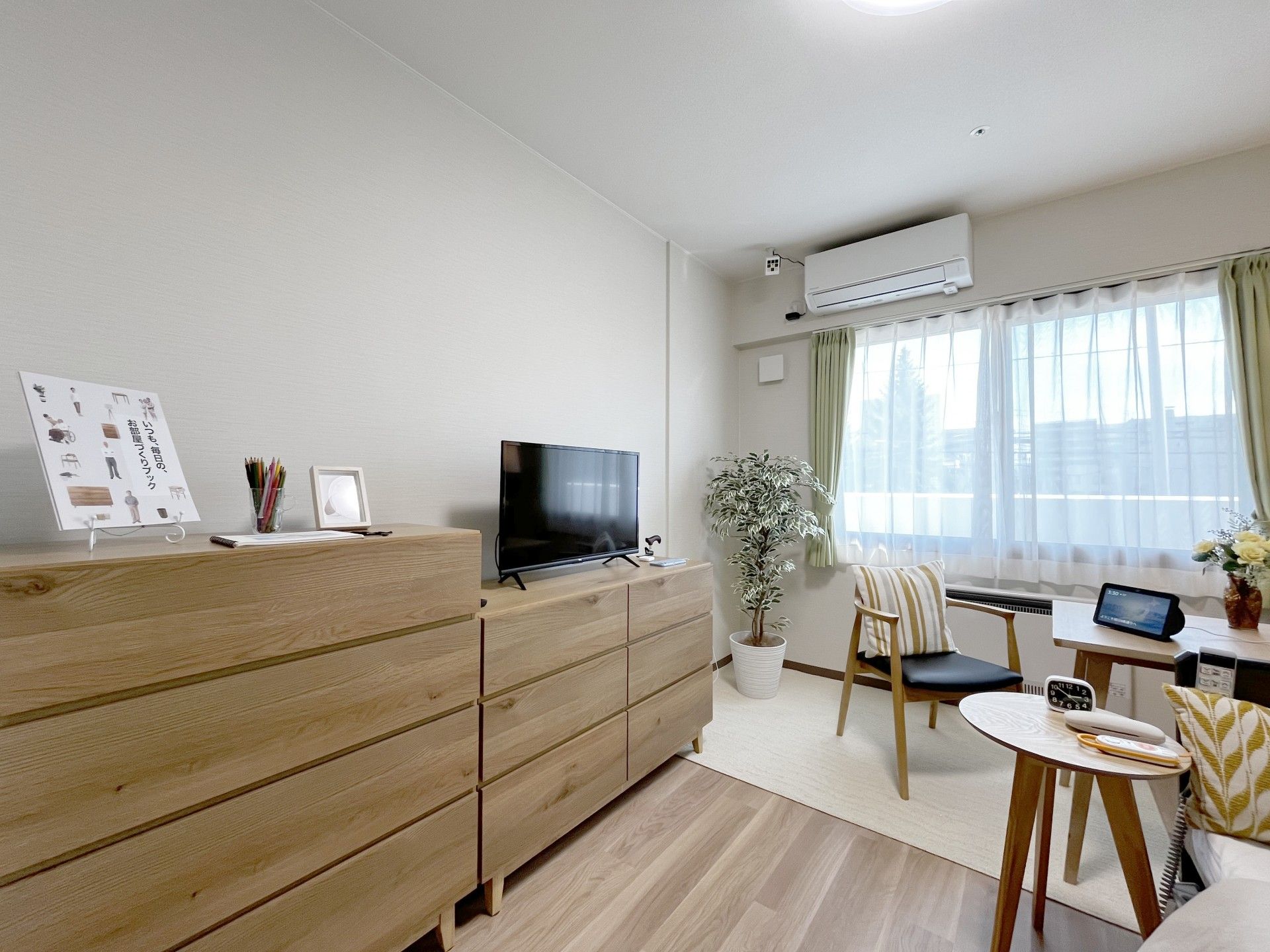 • モデルルーム 約11畳のお部屋に、介護ベッド、エアコン、洗面台、収納、温水洗浄機能付トイレ、ケアコールを完備。全 室個室です。家具のお持ち込みもできるため、今までと同じような雰囲気で過ごすことができます。