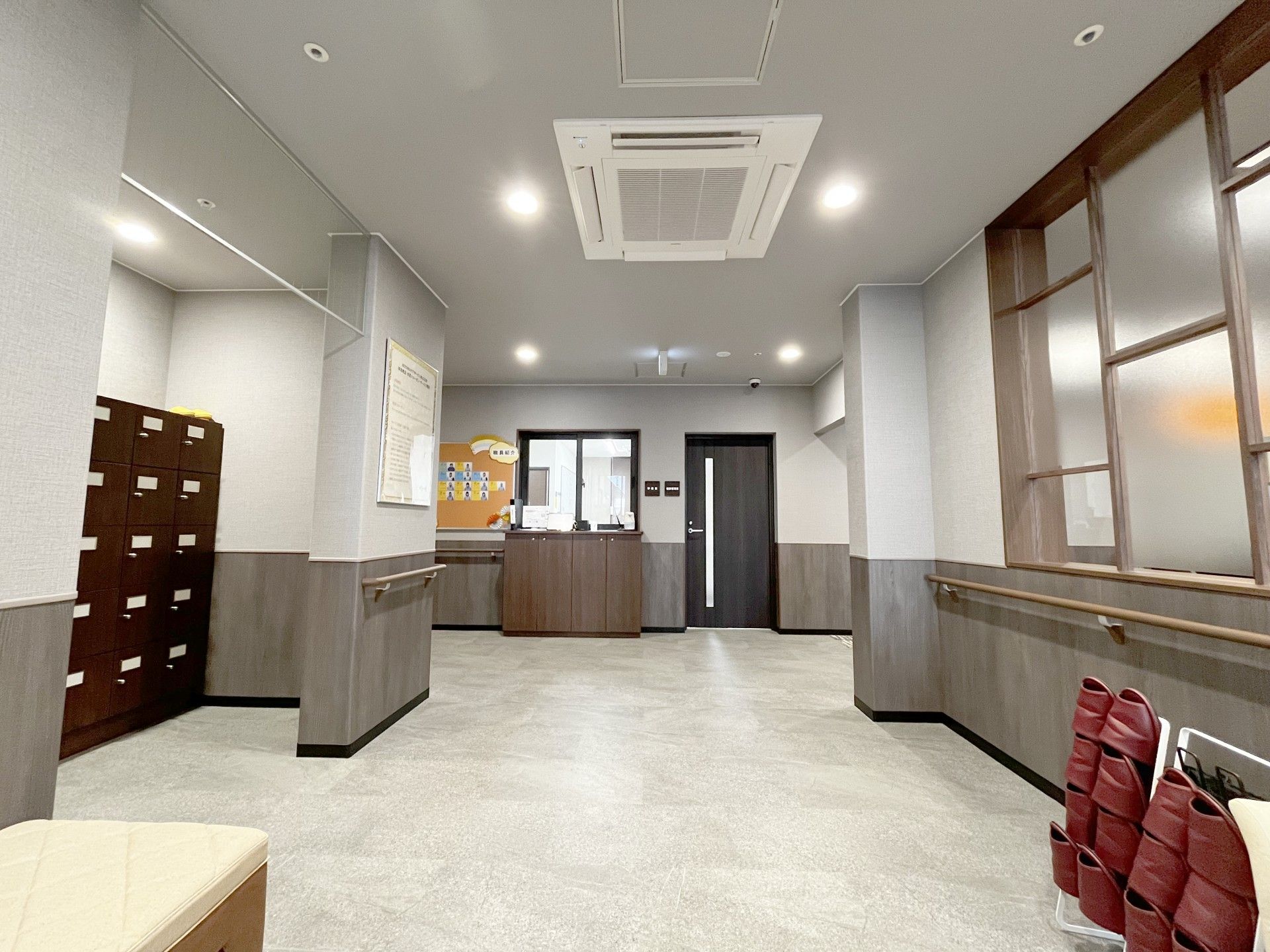 • エントランス 明るいエントランスには、来館者がすぐわかるよう事務室の受付があります。ご来館やお帰りの際に事務スタッ フとのコミュニケーションが容易となり、ご家族様との一体的なケア提供に取り組んでおります。