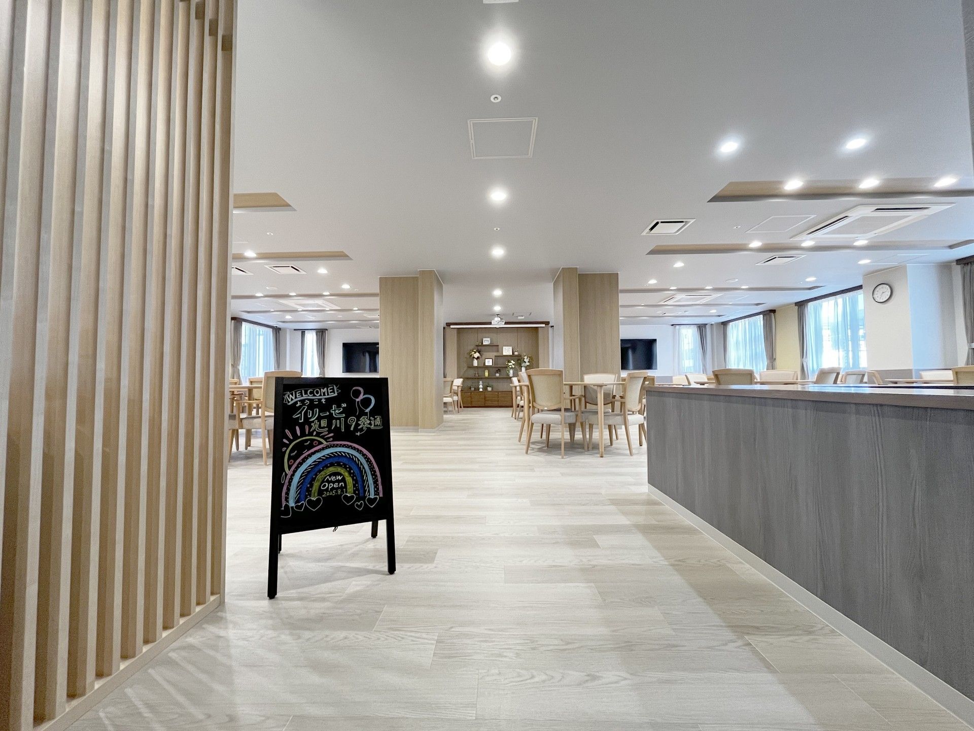 • 食堂兼機能訓練室 全員が集まれる食堂は、明るく開放的な空間です。レクリエーションや季節ごとのイベント(夏祭りやクリスマ ス会など)でも使っており施設内でも一番賑やかな場所です。