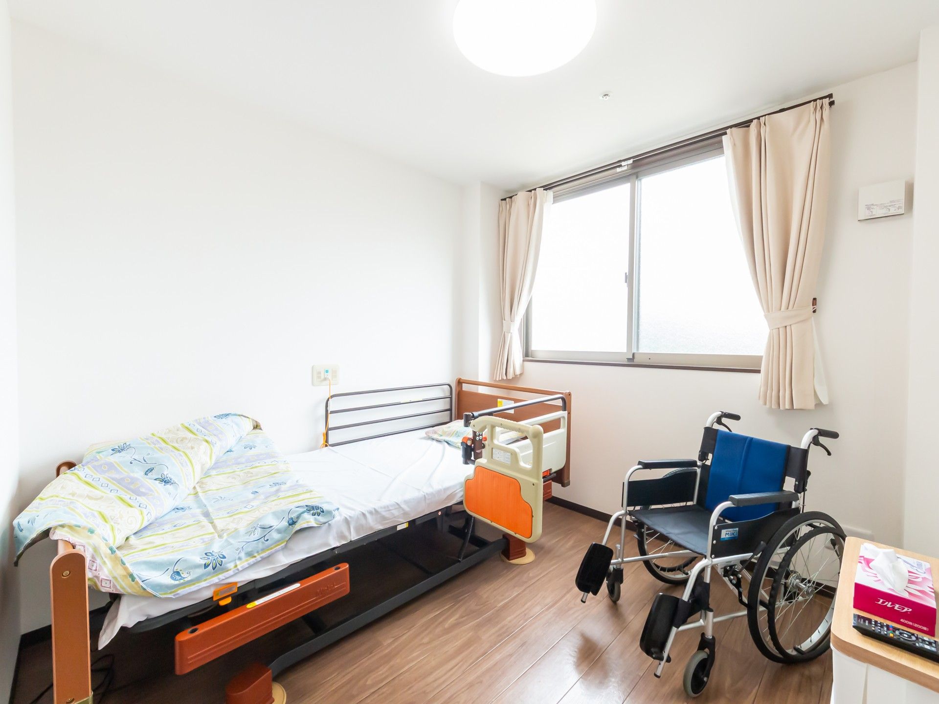 窓からの光が差し込む明るい部屋です。車椅子も置ける広さで、快適に過ごせます。