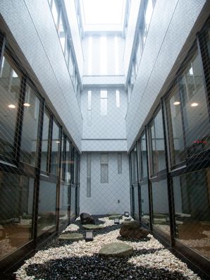 ご入居者様が快適に、ハッピーに過ごせるように、また時間を有意義に使ってもらうために、当施設の外出は自由となっております。堅苦しさや窮屈さを感じることなく、お散歩や、ちょっとそこまでの用事、ご家族様との大切な時間をお過ごしください。各部屋を仕切るようにガラスで囲われた小さな庭園が見える癒しの空間は日光が入り、夜になると灯りが点く、当施設の魅力のひとつです。また、防犯カメラが複数台設置されており、玄関はオートロックです。防犯対策が整っているので、不安なく暮らしていただけます。