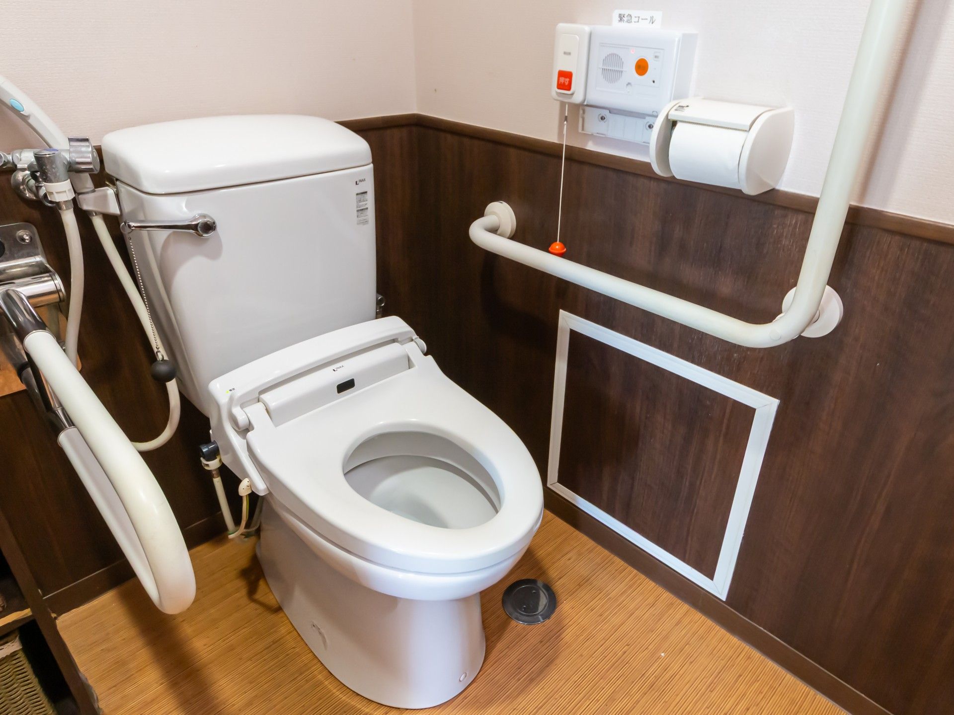 車いすの方がスムーズに動き回れる快適なトイレの様子。立ち上がりや移動がスムーズに行えます。
