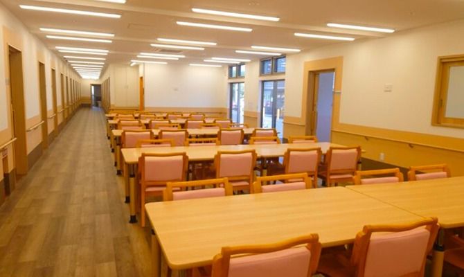 1階には広々とした食堂兼コミュニティホールを設け、ご入居者様同士の交流の場としてご自由にお使いいただけます。共有スペースには防犯カメラを設置し、防犯対策はもちろん、転倒などの事故発生時にも迅速に対応できる体制を整えています。館内はバリアフリー設計を採用し、廊下の段差をなくし手すりを完備。エレベーターは車椅子の方も利用しやすいよう一般的なものより広く設計されています。食事は外部給食業者による塩分・カロリー管理された食事を提供しており、食材の柔らかさにも配慮しています。