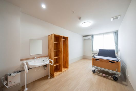 • 居室 広い窓から自然光が差し込む個室です。ベッドや設備が整い、快適に過ごせる空間です。