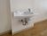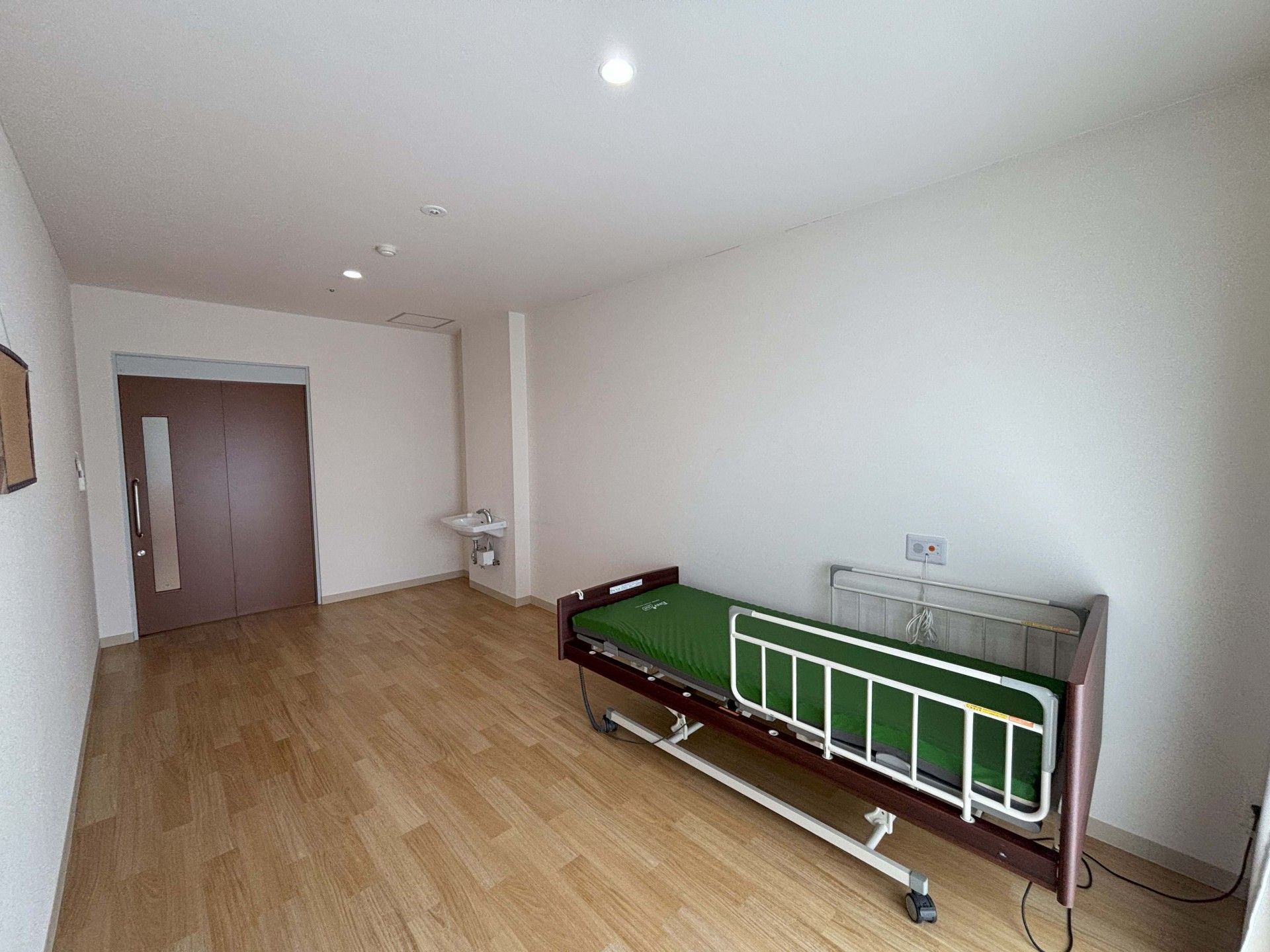 ベッドと洗面台が備わった居室です。シンプルな空間で、落ち着いた時間をお過ごしいただけます。