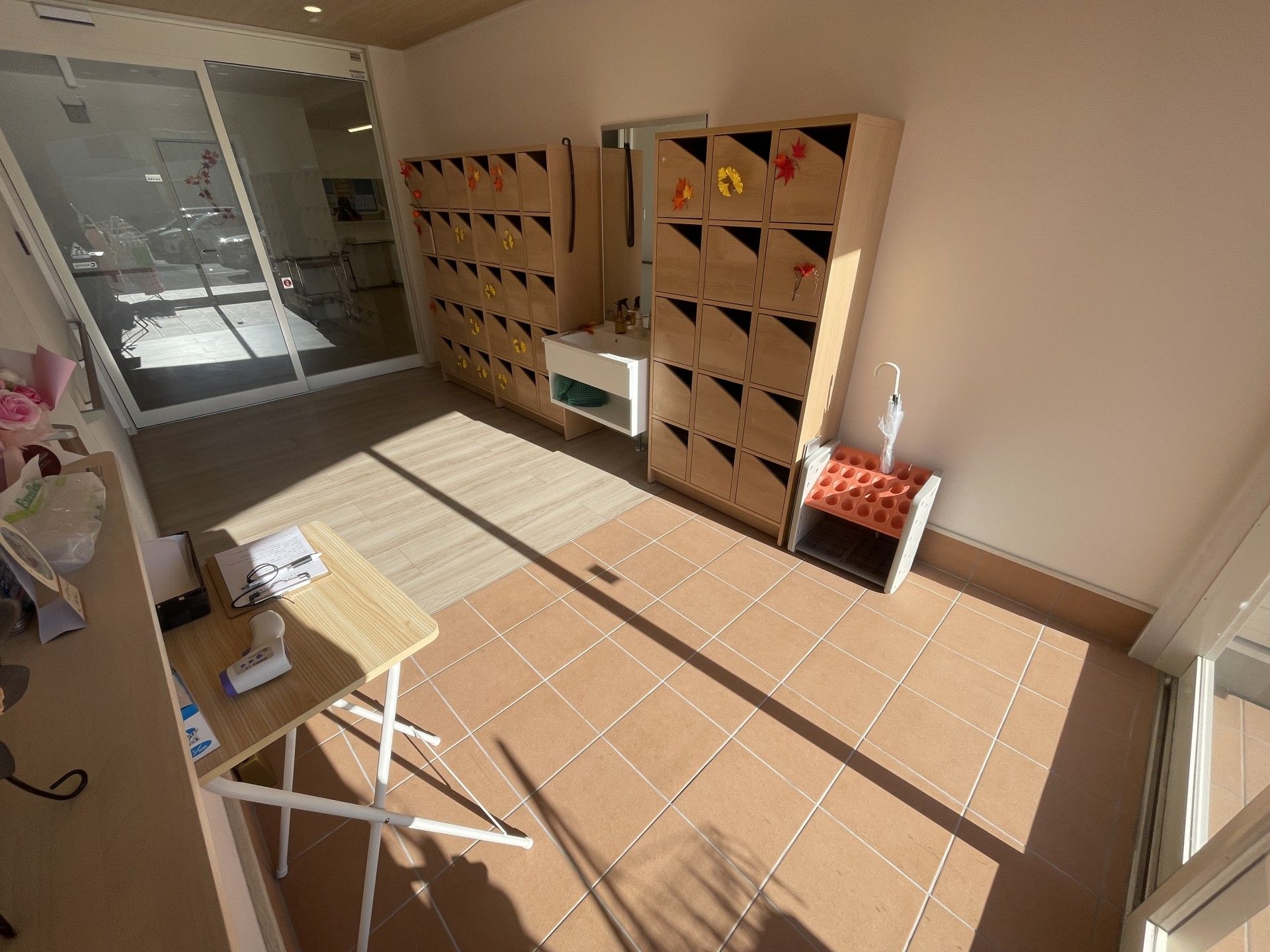 日差しが差し込むエントランスには、靴箱と傘立てが整然と配置されています。