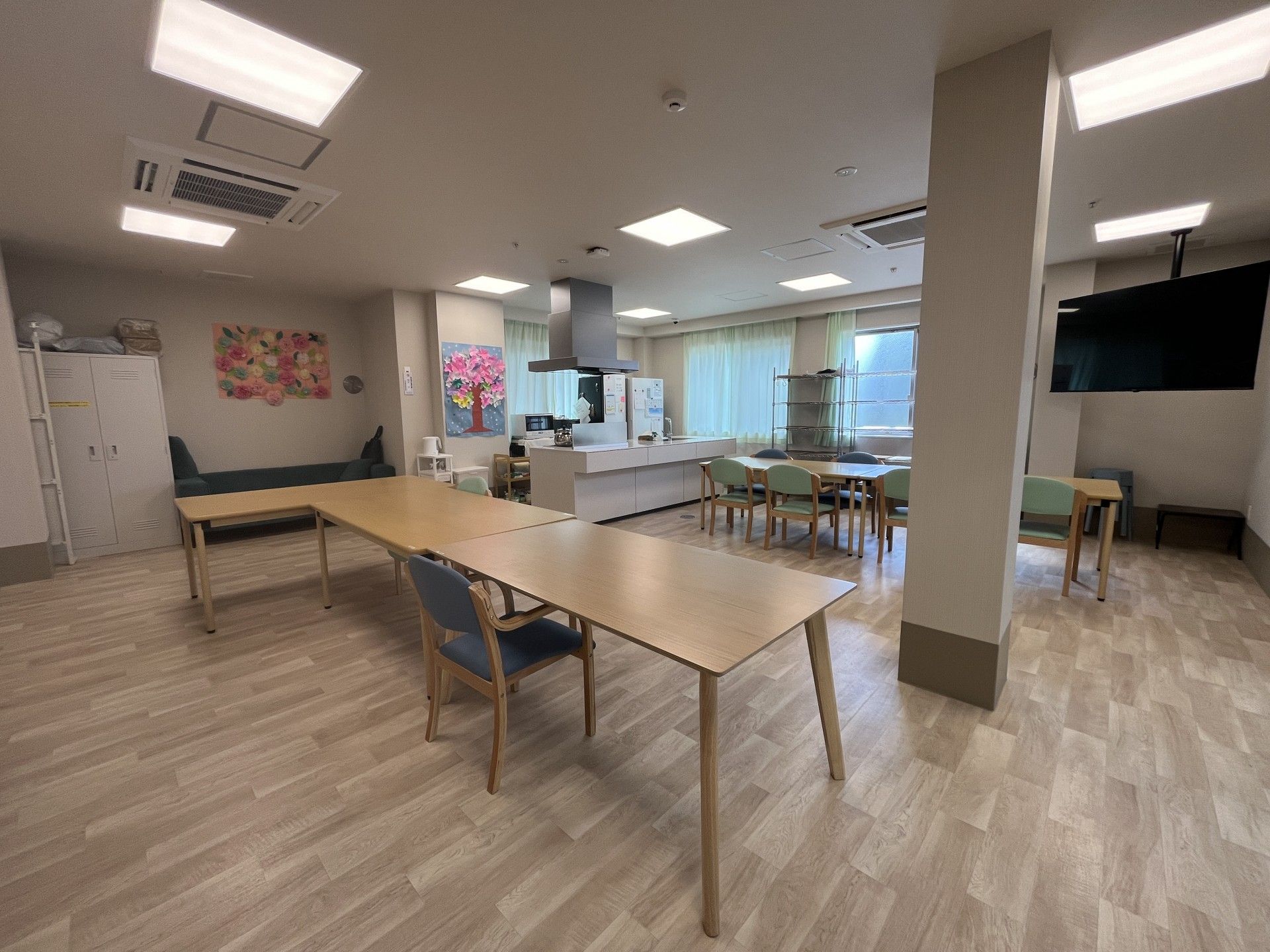 大きなテーブルが並ぶ明るい空間で、皆さんが集まりやすい雰囲気です。リラックスして過ごせます。