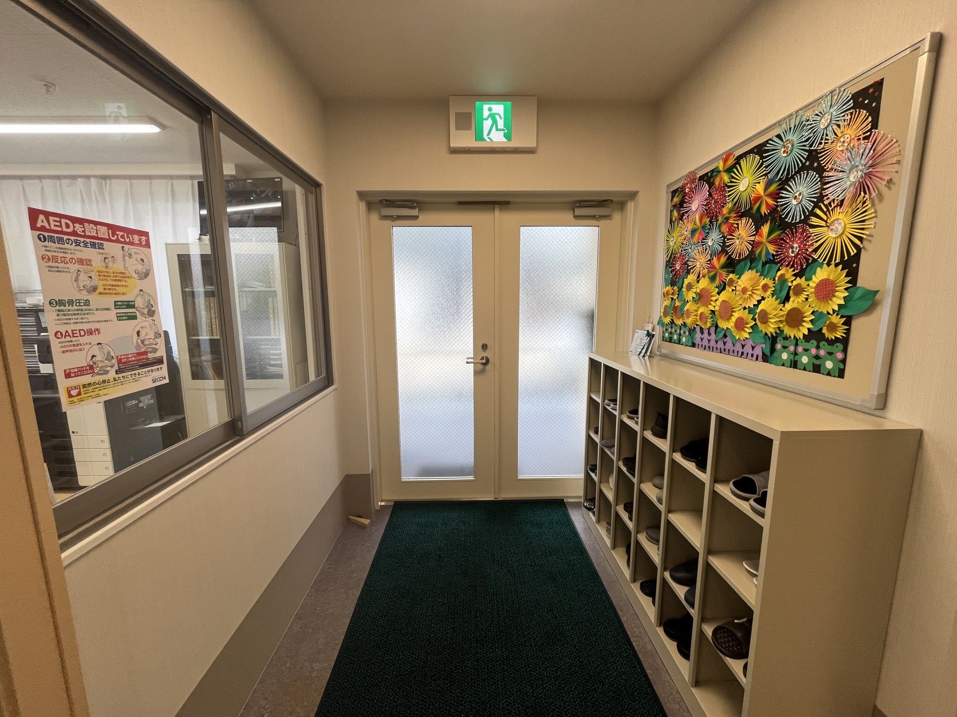 色とりどりの飾りが壁に飾られた明るい廊下です。出入口にはスムーズに通れる扉があります。