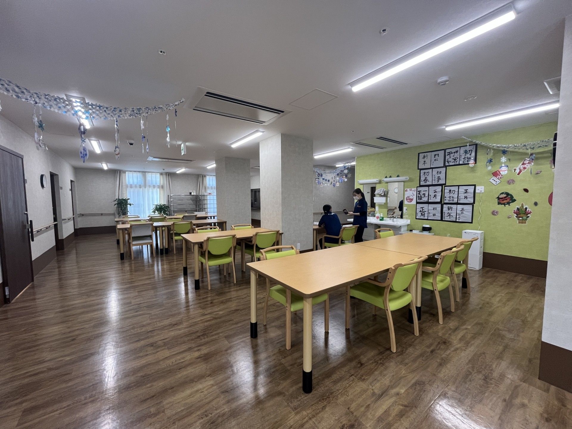 広々としたテーブルと椅子が並び、皆さんで楽しく過ごせる空間です。