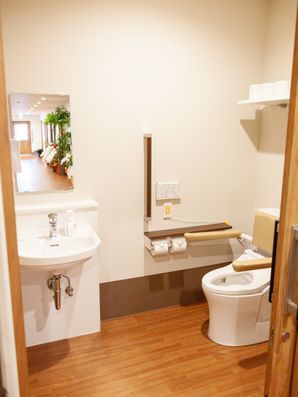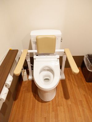 手すり付きのトイレ設備で、安全にご利用いただけます。清潔感のある空間が保たれており、快適です。