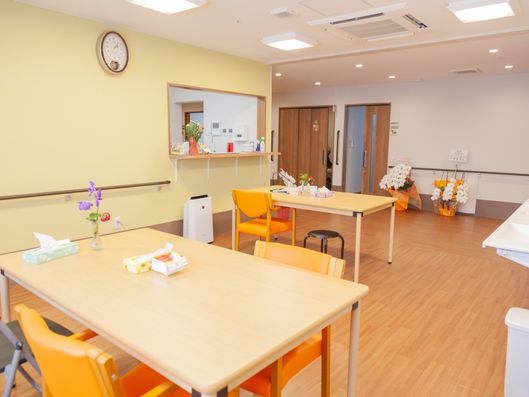 広々としたダイニングでは、テレビを見ながらゆったりとお食事ができ、窓からは自然光が差し込みます。車椅子用のスペースも確保されており、快適にお過ごしいただける環境です。
