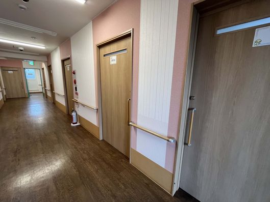 ゆったりとした廊下が続く居室入口です。手すりが設置されており、安心して歩行できる設計になっています。