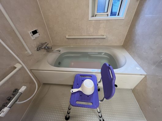 安全に配慮された浴室です。手すりやシャワーチェアが整っており、安心してご利用いただけます。