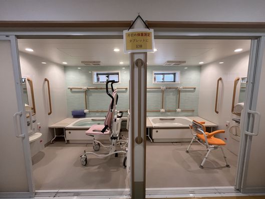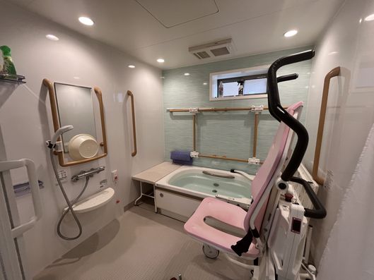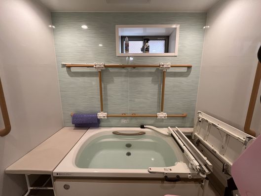 車椅子対応の設備が整った浴室です。安全に配慮された手すりが設置されています。