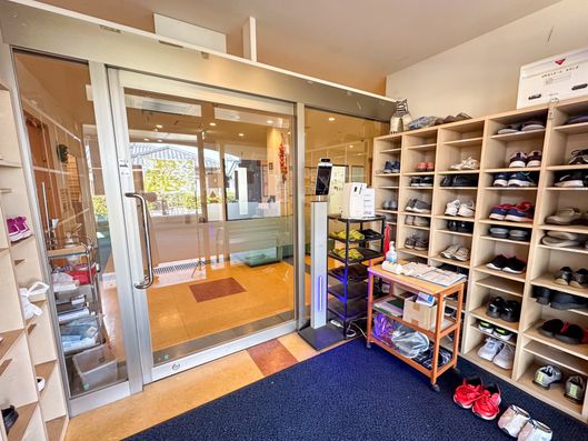 ゆったりとしたベンチが置かれた入口です。安心のAEDも完備しており、待ち時間も快適にお過ごしいただけます。