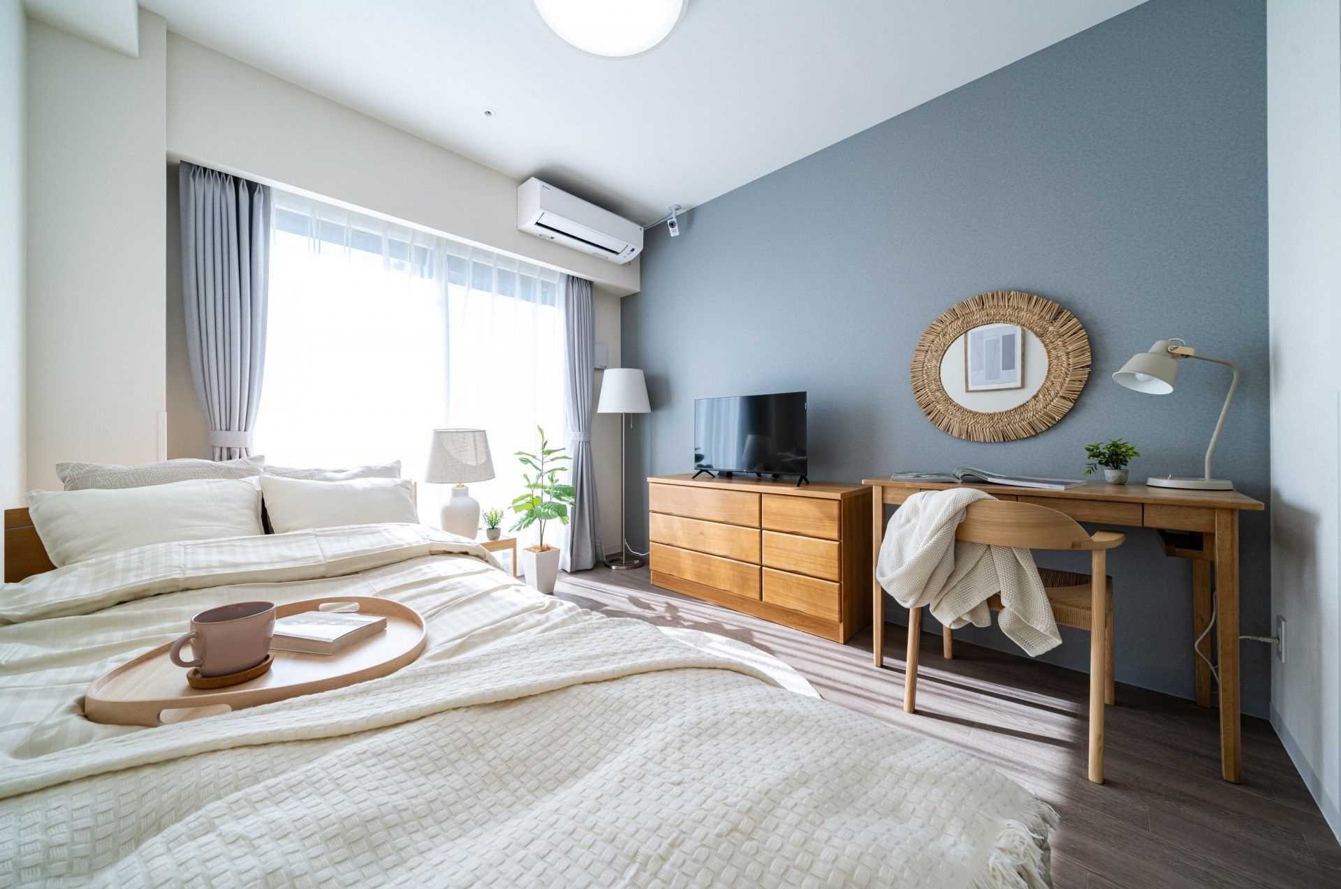 窓からの自然光が心地よい空間です。ソファとベッドが配置され、くつろぎの時間をお過ごしいただけます。