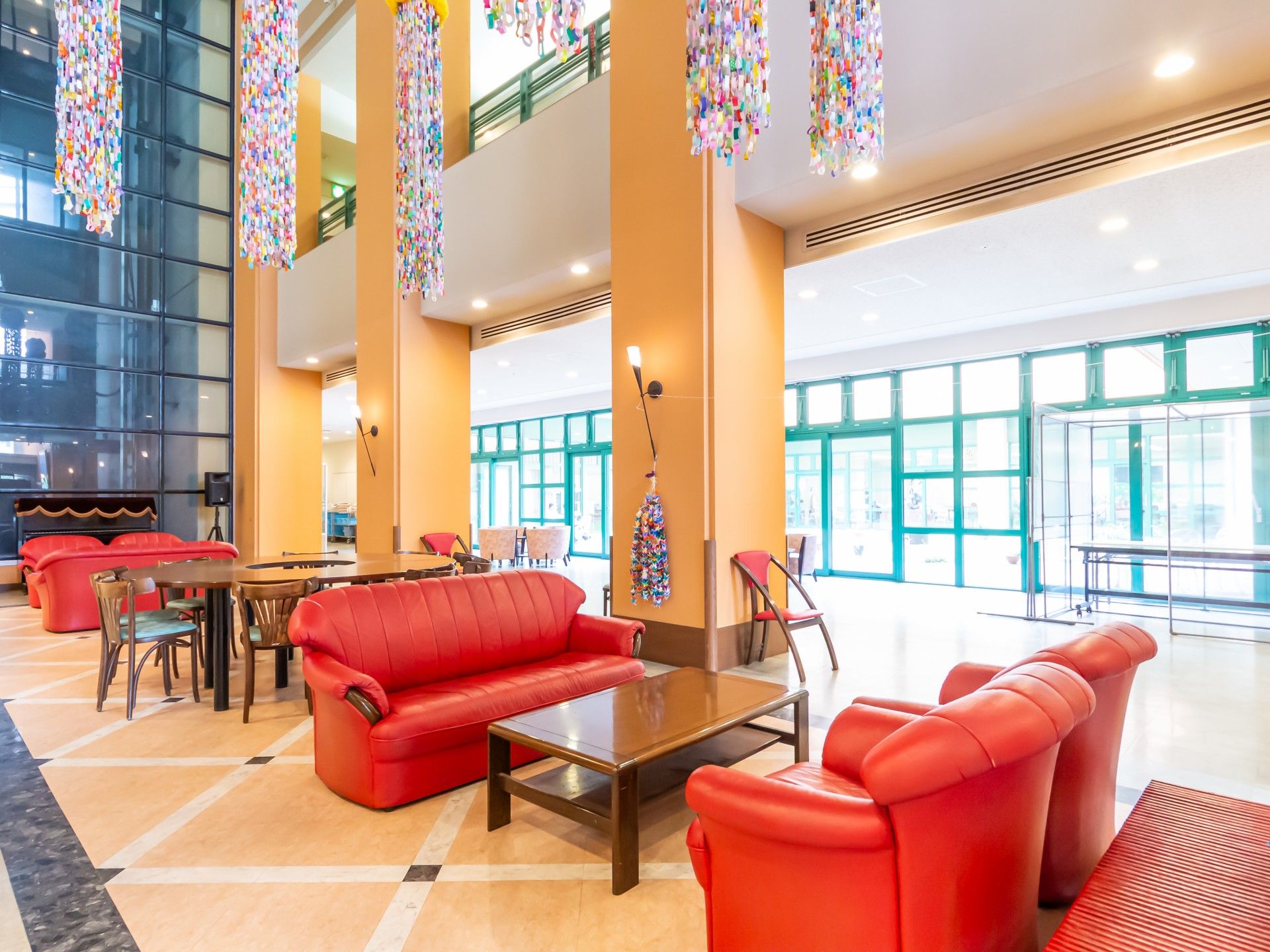 広々としたエントランスには、赤いベンチが並び、訪れる方を温かく迎えます。