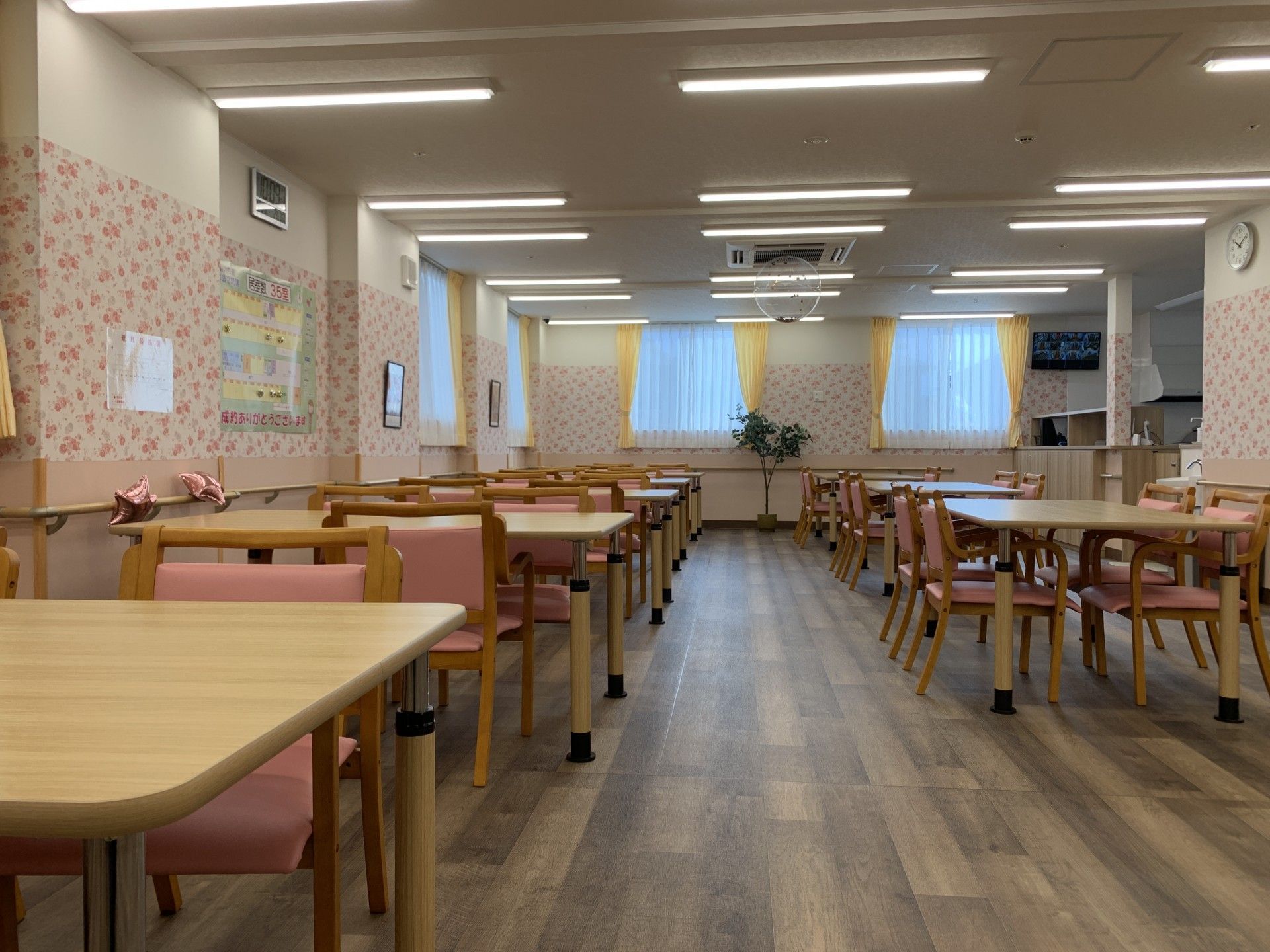 窓からの自然光が差し込む明るい食堂です。ゆったりとしたテーブル配置で、快適にお過ごしいただけます。